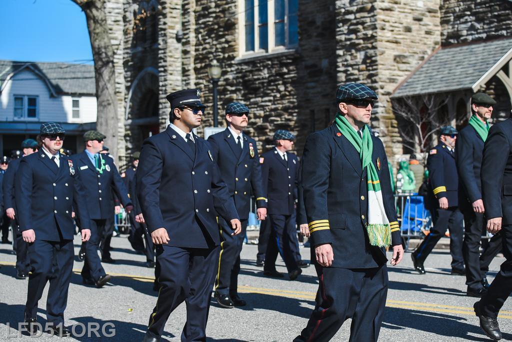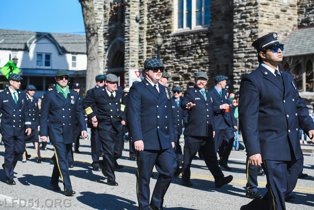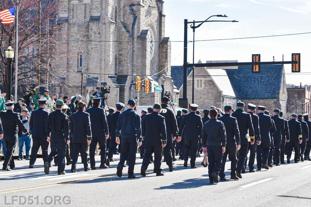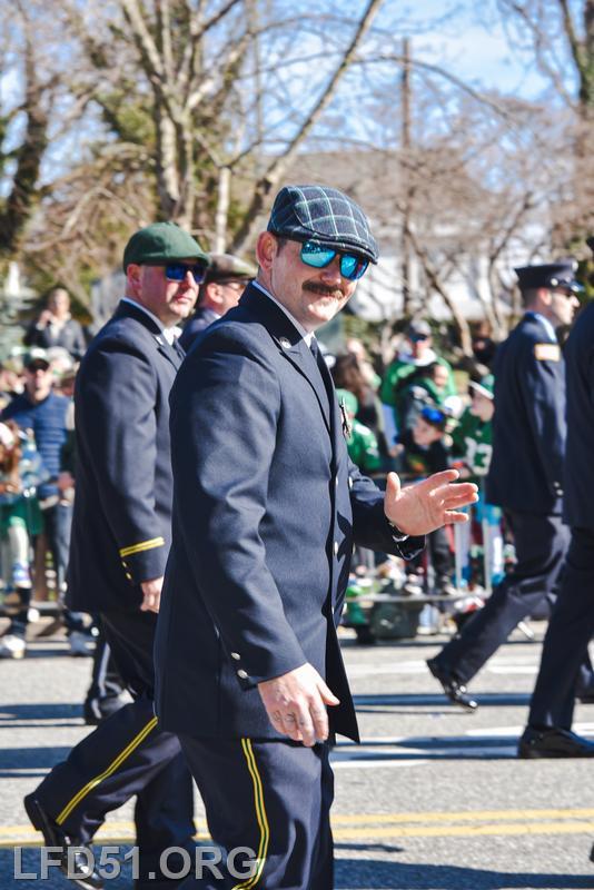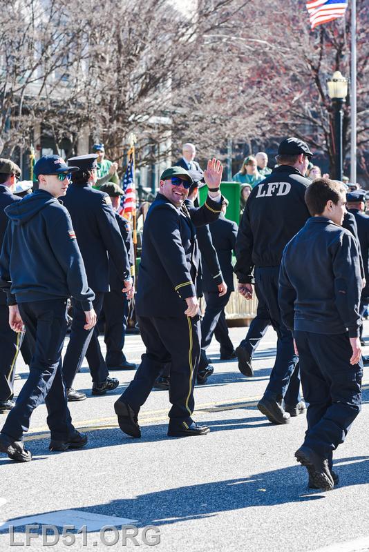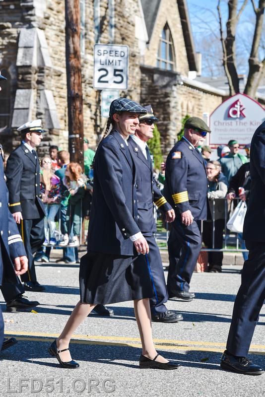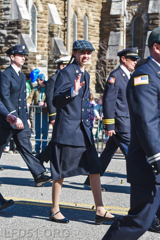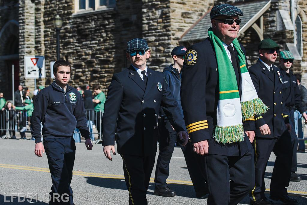| Several of our members participated in the annual St. Patrick's Day Parade in Conshohocken on March 14. The evening before, crews washed and waxed Engine 51 until it shone, preparing it for parade presence! Our firefighters marched alongside other Montgomery County firefighters during the parade. It was a beautiful day for a parade with a great crowd! |
