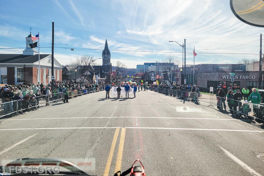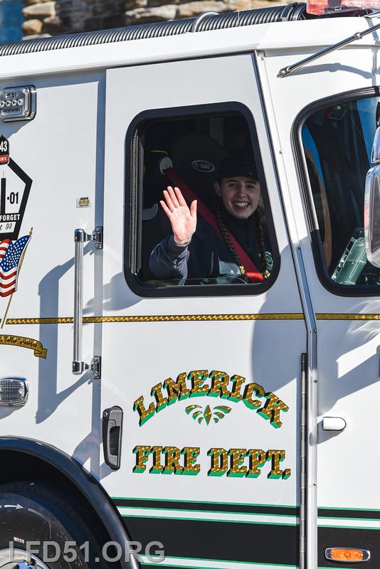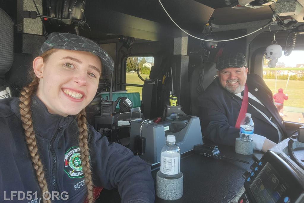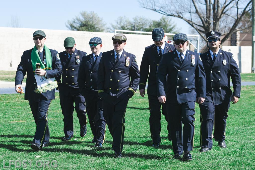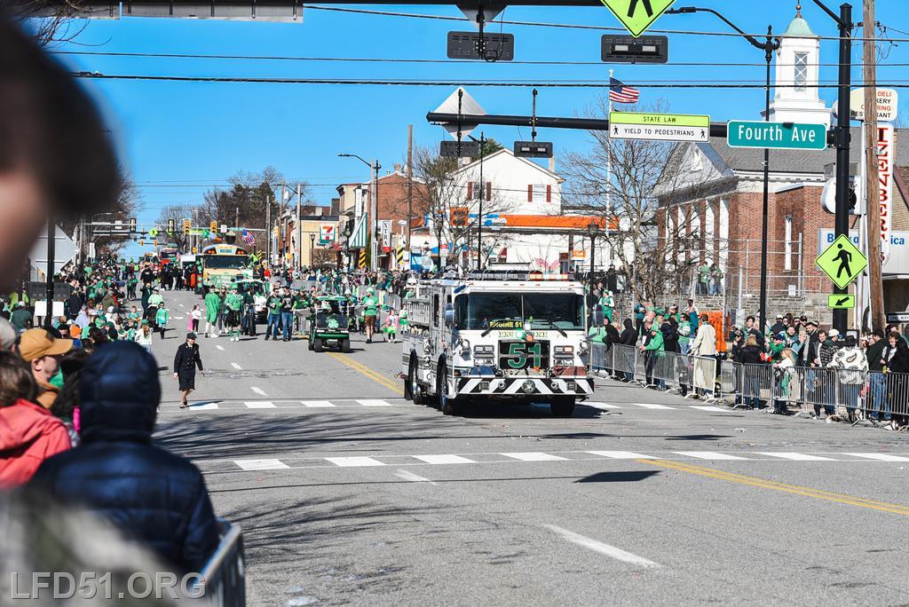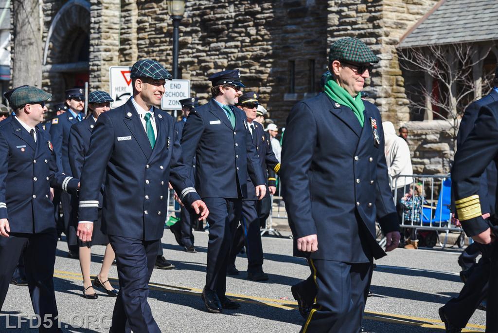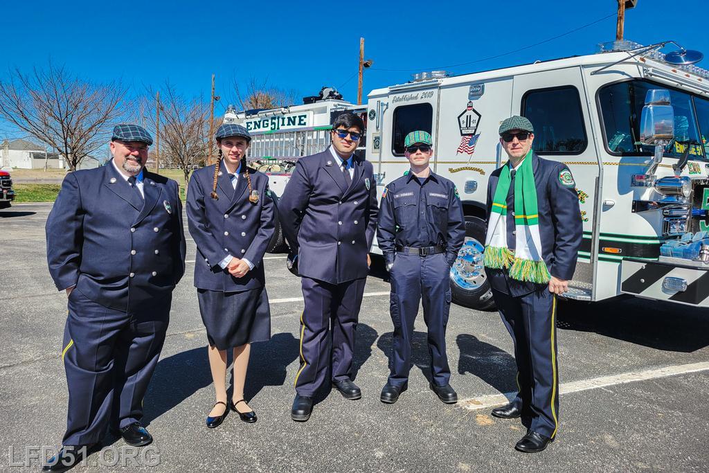 | Several of our members participated in the annual St. Patrick's Day Parade in Conshohocken on March 14. The evening before, crews washed and waxed Engine 51 until it shone, preparing it for parade presence! Our firefighters marched alongside other Montgomery County firefighters during the parade. It was a beautiful day for a parade with a great crowd! |