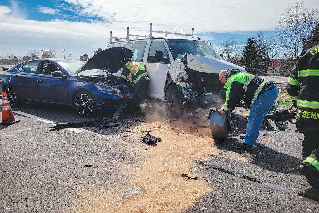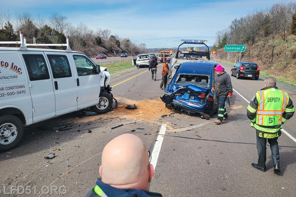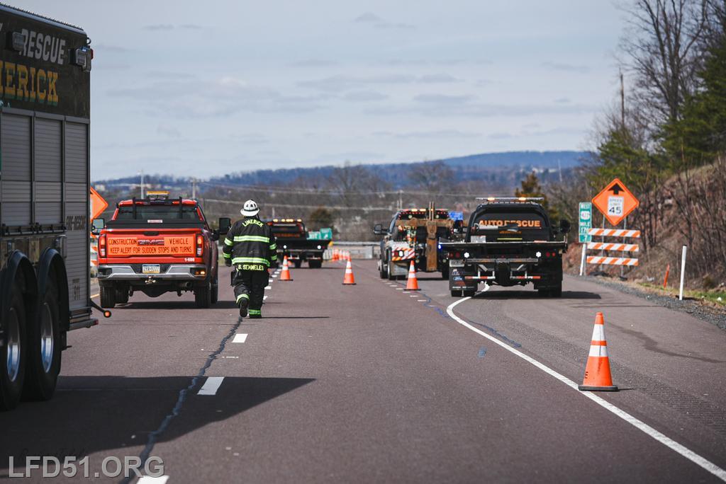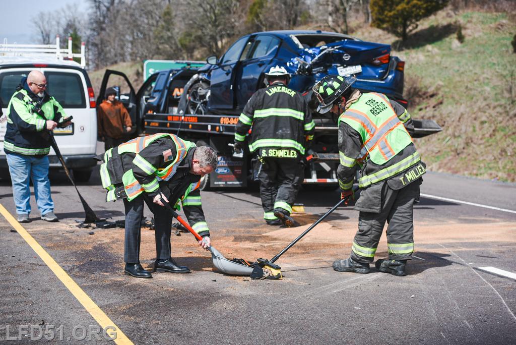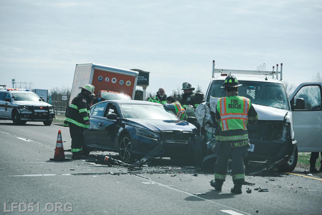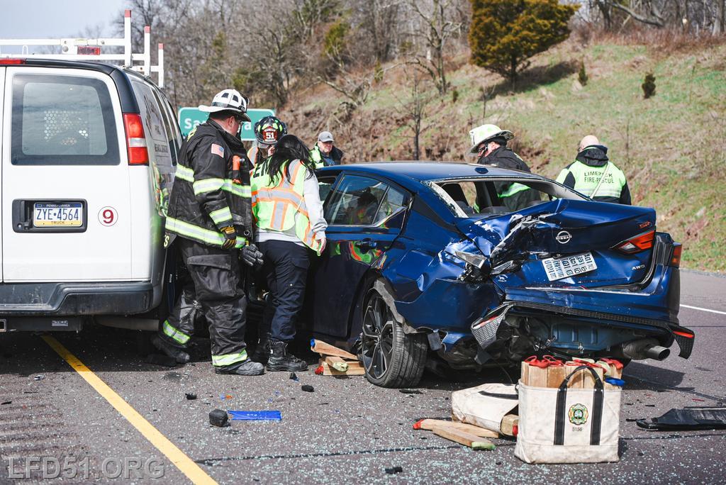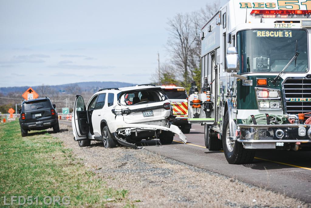 | At 12:04 pm on March 18, the Limerick Fire Department was dispatched to a four-vehicle accident on Route 422 WB. Deputy 51, Chief 51, Rescue 51, 51 Fire Police, Freedom Valley EMS, and PA State Police responded. Dispatch reported there were conflicting reports on whether anyone was entrapped. Deputy 51 arrived, confirmed that one occupant was trapped in their vehicle, and assumed 422 Command.